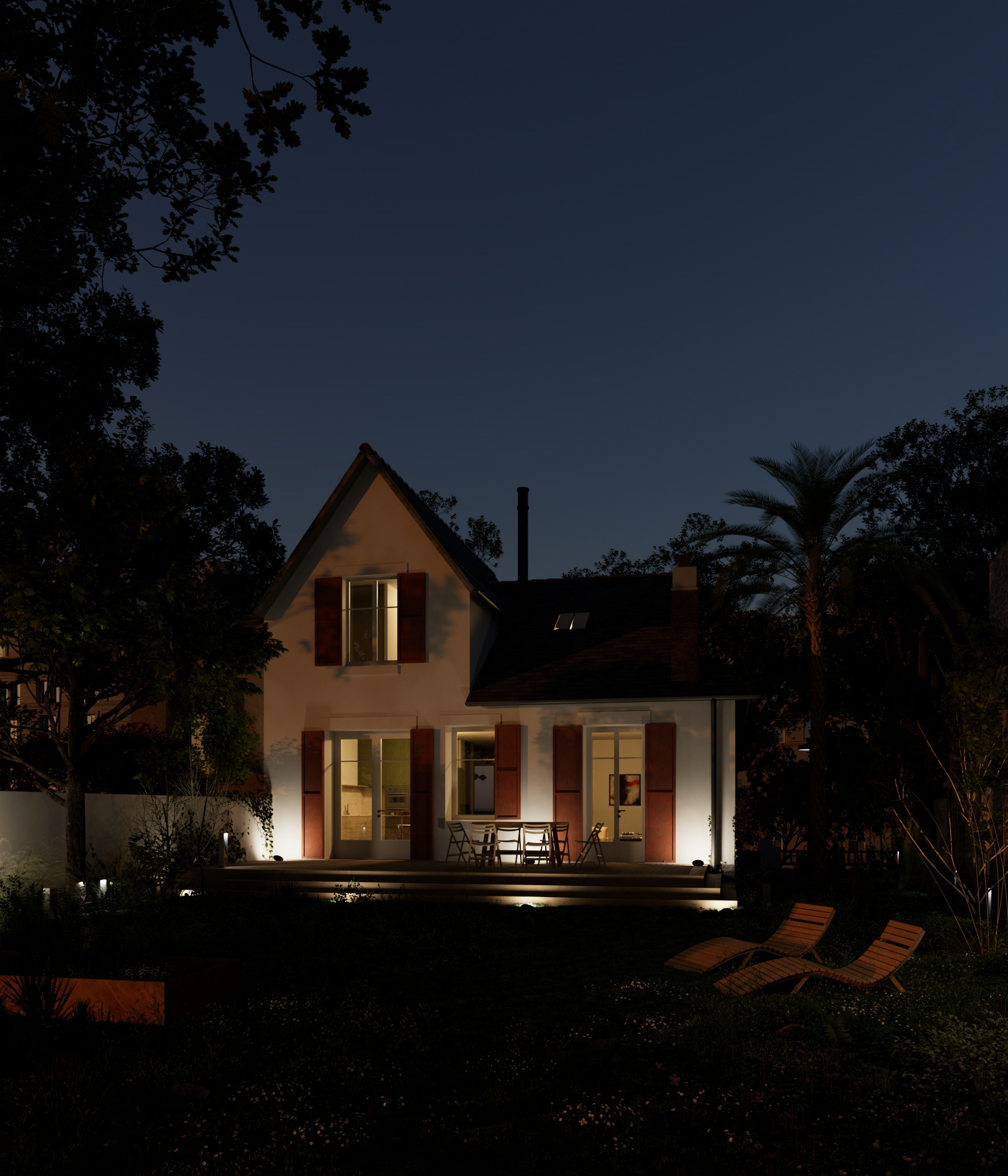 Les menuiseries bois sont remplacées à l’identique et accompagnées de volets bois reconstitués ou restaurés. Les éléments de menuiserie extérieure (volets, charpente, portes d’entrée et de garage) sont peints en rouge brun, rappelant la teinte de la brique.